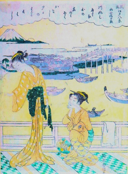明和2(1765)年に多色摺りの技術が開発されたので、それを用いて春信が画いた美人画は、飛ぶように売れました。それは、錦織物のような美しさを持つとして、東錦絵と呼ばれました。画像18は、瀟湘八景の八つの画題にちなみ、江戸の名所を画いたものの一枚です。春信の絵にしては、珍しく、両国橋の北側の風景が詳細に描かれています。夕涼みで縁側に座っている女の背後には、漁師が打ち網で魚をとつています。江戸は、リサイクル社会で、たくさんの汚物が川に流れ込まなかったので、隅田川には魚が生息し、それが新鮮な魚として食されていたのです。