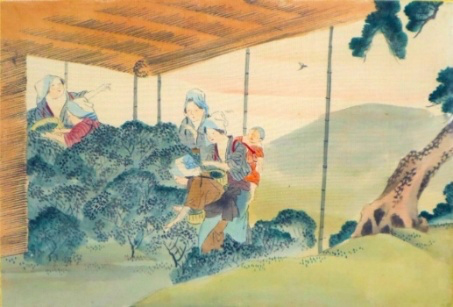 棚の下では、五人の女が、茶摘みをしています。一人の女は、赤子をおんぶして仕事をしています。これは、当時の宇治における典型的な茶摘み風景だったのでしょう。