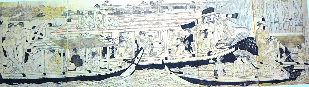 千葉市美術館の栄之展では、紅嫌い(黒色、灰色、紫色を基調にした絵)の「四つ目屋内うち七町」が展示されていました。展示のカタログによれば、「3枚続きの1枚と思われる」(33頁)ということです。それは、チラシの絵の一組大判3枚の対として刊行されたのかもしれません。武蔵屋画廊では、私のコレクションの「四つ目屋内うち七町」も展示します。この他にも、紅嫌いの大判5枚続絵「舟遊び」などの魅力的な浮世絵を展示します。もしよろしければ、ご来場いただければ幸いです。