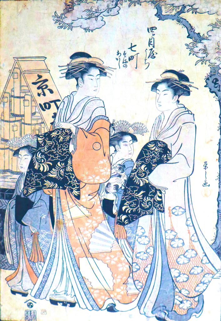 上に掲載した栄之展のチラシには、一組大判3枚で刊行された、3人の花魁道中の絵が挿入されています。この絵では、3人の花魁が、それぞれ2人の禿と1人の振袖新造を従えて、引手茶屋で待っている馴染み客を迎えに行く道中の様子が描かれています。彼らは、吉原の仲之町通りに飾られた梅の木の脇を通って歩いているのです。この一組大判3枚は、千葉市美術館で展示されなかったので、おそらく、日本の美術館や博物館では所蔵されていないと思われます。